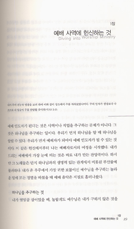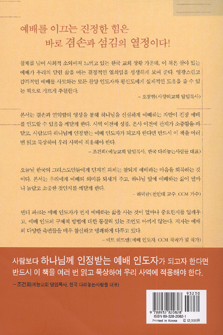 본서는 겸손과 연약함의 영성을 통해 하나님을 신실하게 예배하는 자만이 진정 예배를 인도할 수 있음을 깨닫게 한다. 사역 이전에 성품, 은사 이전에 관계가 소중함을 깨닫고, 사람보다 하나님께 인정받는 예배 인도자가 되고자 한다면 반드시 이 책을 여러 번 읽고 묵상하여 우리 사역에 적용해야 한다.