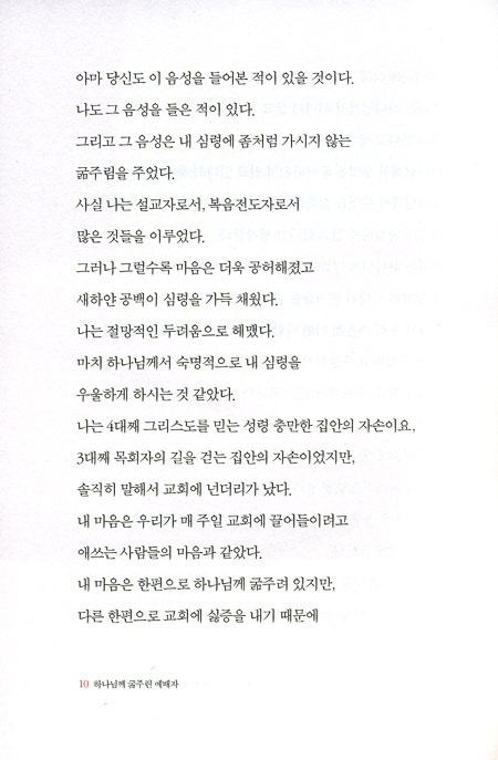 요즈음은 좋은 것이 최선의 것을 가로막는 원수가 되어버렸다. 지금 이 순간, “성령으로 당신 심령을 부수라”라고 도전하고 싶다. 바야흐로 지금은 당신 삶을 거룩하게 할 때이다. 지금까지 지켜보던 것들을 그만 지켜보라. 하나님 말씀을 읽는 것보다 어떤 것을 더 많이 읽었다면, 그동안 읽던 것들?그만 읽어라. 하나님을 가장 먼저, 가장 간절하게 배고파해야 한다.