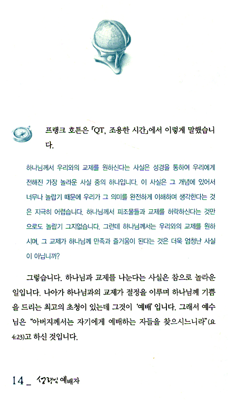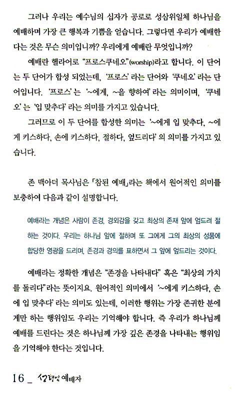 “예배는 기독교인의 신앙생활의 기본이자 기준입니다. 이 책의 제목이 「성령님 예배자」인 이유가 있습니다. 우리의 노력으로 드려지는 예배가 아니라, 성령님의 도우심과 인도하심을 받는 예배자들이 되어 하나님께 영광을 드리는 예배를 드려야 함을 강조하기 때문입니다. ‘성령님과 친밀하게 동행하는 삶’이 곧 예배의 삶임을 강조합니다.… 문제는 예배를 아무리 많이 드려도 성도님들이 하나님과 동행하는 삶을 살아가는 모습을 보이지 않는다는 것입니다. 오히려 그 열매가 좋지 않아서 비신자들에게 비판을 받습니다. 신앙생활의 중심인 예배가 회복되어야 하나님과 동행하는 삶을 회복할 수 있음을 우리는 알아야 합니다.”