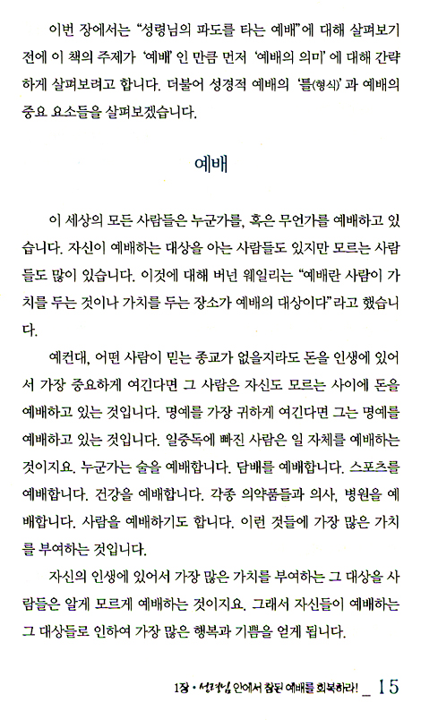 하나님이 찾으시는 참된 예배자가 되게 한다. 참된 예배, 진정한 예배의 삶을 회복하게 도와준다.