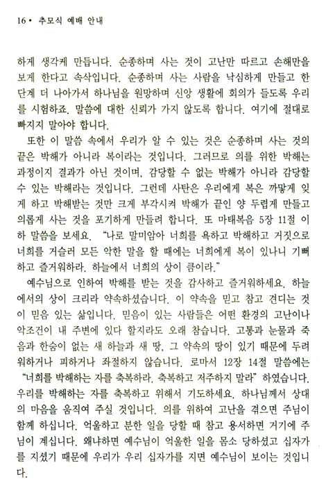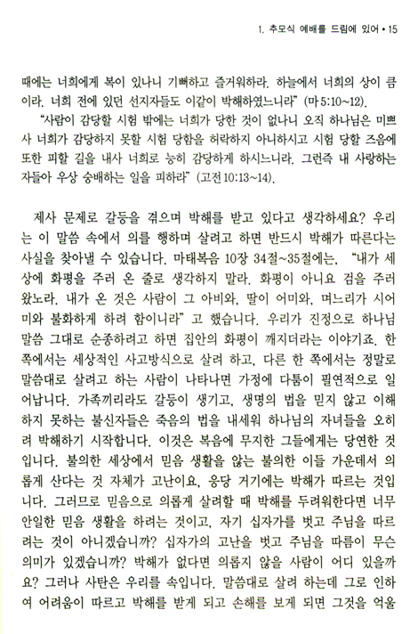 제사 문제로 갈등을 겪으면서 박해를 받고 있다고 생각하세요? 우리는 이 말씀 속에서 의를 행하며 살려고 하면 반드시 박해가 따른다는 사실을 찾아낼 수 있습니다. 마태복음 10장 34절-35절에는 “내가 세상에 화평을 주러 온 줄로 생각하지 말라. 화평이 아니요 검을 주러 왔노라. 내가 온 것은 사람이 그 아비와, 딸이 어미와, 며느리가 시어미와 불화하게 하려 함이니라”고 했습니다. 우리가 진정으로 하나님 말씀 그대로 순종하려고 하면 집안의 화평이 깨지더라는 이야기죠. 한쪽에서는 세상적인 사고방식으로 살려 하고, 다른 한 쪽에서는 정말로 말씀대로 살려고 하는 사람이 나타나면 가정에 다툼이 필연적으로 일어납니다. 가족끼리라도 갈등이 생기고, 생명의 법을 믿지 않고 이해하지 못하는 불신자들은 죽음의 법을 내세워 하나님의 자녀들을 오히려 박해하기 시작합니다. … 불의한 세상에서 믿음 생활을 앓는 불의한 이들 가운데서 의롭게 산다는 것 자체가 고난이요, 응당 거기에는 박해가 따르는 것입니다. 그러므로 믿음으로 의롭게 살려할 때 박해를 두려워한다면 너무 안일한 믿음 생활을 하려는 것이고, 자기 십자가를 벗고 주님을 따르려는 것이 아니겠습니까? 십자가의 고난을 벗고 주님을 따름이 무슨 의미가 있겠습니까? 박해가 없다면 의롭지 않을 사람이 어디있을까요?