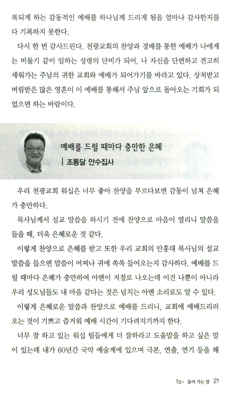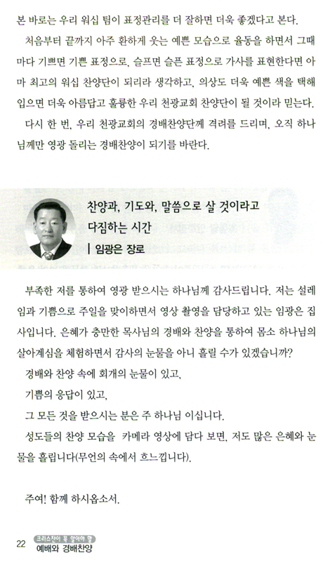 저는 이 책의 원고를 보면서, 이 책에서 저자가 주장하는 경배와 찬양의 이론은 한낱 수사학적인 주장이 아니라는 것을 느꼈습니다. 여기에서 다루어지고 있는 글은 익산천광교회 주일 예배의 산 증거입니다. 이 책을 볼 때, 하나님의 말씀인 성경의 진리는 일점일획도 변함이 없지만, 현대인을 구원하기 위하여 현대인에 맞는 예배문화를 과감하게 만들어 적용함으로써 예배의 갱신이 이루어졌음을 설명하는 내용에 동의하면서, 저자의 경배찬양에 대한 인식이 바람직하다고 생각합니다.