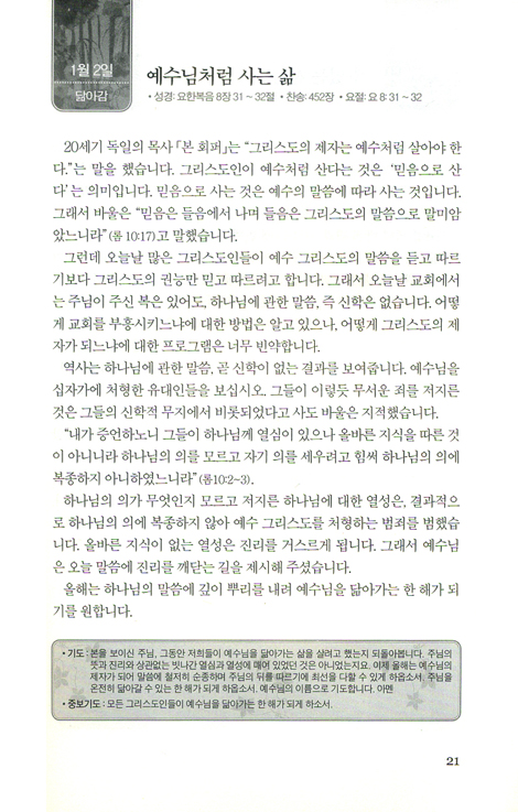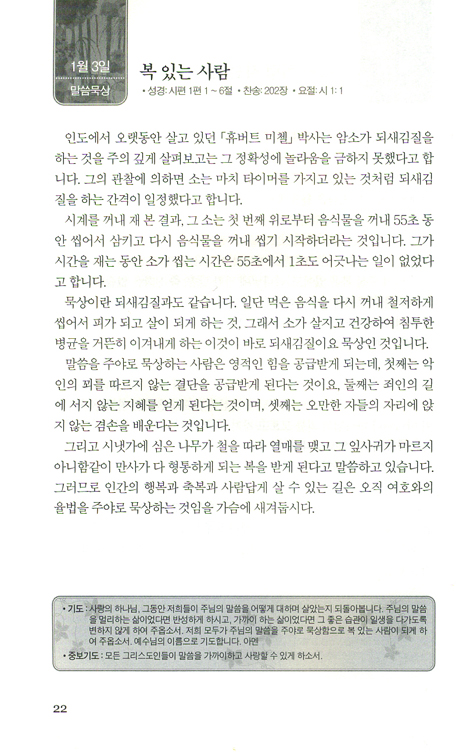 매일 성경과 함께 주님의 말씀을 묵상한다면 우리의 영혼이 하늘의 양식으로 풍성하게 채워지는 놀라운 은혜를 경험하게 될 것입니다. 영혼이 잘되고 범사가 잘되며 강건함을 누리는 축복의 삶을 살게 될 것입니다(요삼2). 그리고 채우고 또 채워도 채워지지 않는 인생의 빈 잔에 젖과 꿀이 흘러넘치는 감사의 삶을 살게 될 것입니다.