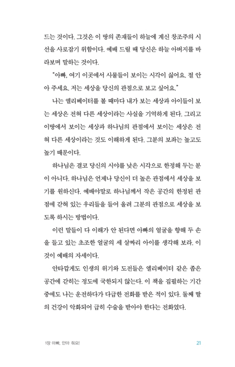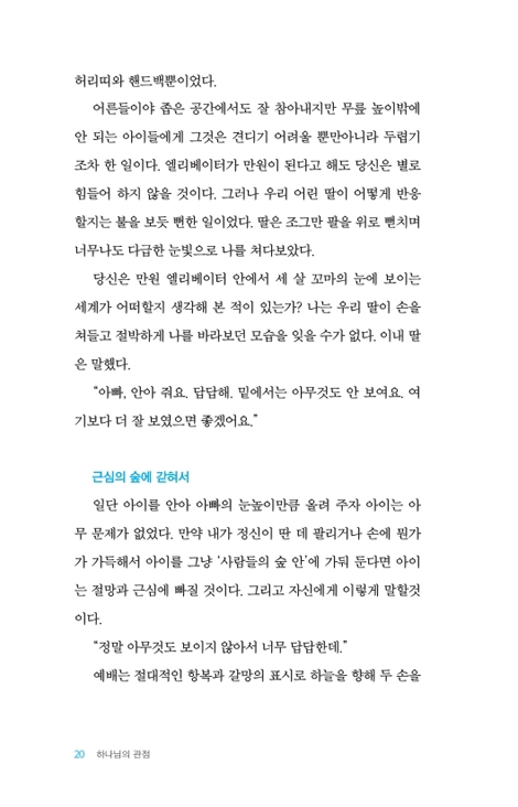 그런데 안타까운 것은, 수많은 사람들이 활주로를 달리는 것 자체를 부끄러워하고, 또는 달리다가도 숨이 차면 멈춰버린다는 점이다. 더 나아가 어떤 이들은 분명히 하늘에서 새로운 관점을 얻었는데 삶으로 돌아와서는 예배가 지속되지 못하면서 그 관점을 상실해 버리고 만다. 나는 독자 여러분에게 성경 옆에 두고 읽어야 할 책으로 이 책 「하나님의 관점」을 꼭 권하고 싶다. 역자인 나 자신도 번역한 지 10년이 지났지만 분명한 성경적 원리와 강렬한 실제적 예화는 지금에도 또렷이 기억에 남아 있다.