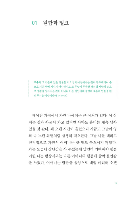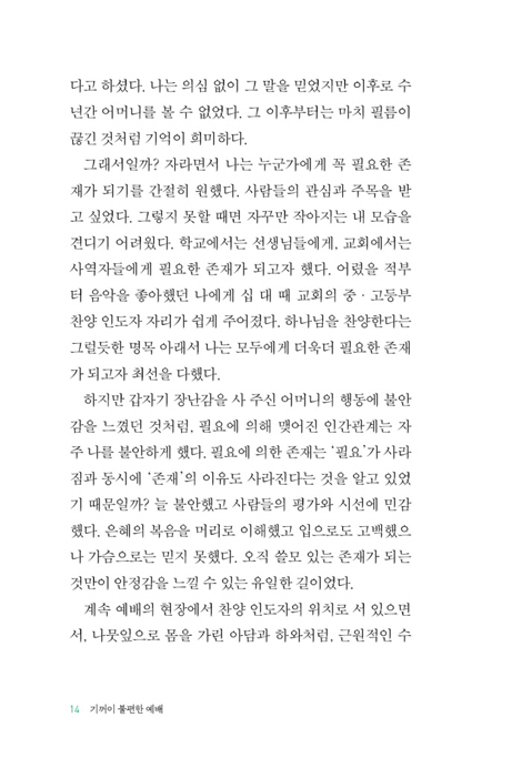 하지만 갑자기 장난감을 사 주신 어머니의 행동에 불안감을 느꼈던 것처럼, 필요에 의해 맺어진 인간관계는 자주 나를 불안하게 했다. 필요에 의한 존재는 ‘필요’가 사라짐과 동시에 ‘존재’의 이유도 사라진다는 것을 알고 있었기 때문일까? 늘 불안했고 사람들의 평가와 시선에 민감했다. 은혜의 복음을 머리로 이해했고 입으로도 고백했으나 가슴으로는 믿지 못했다. 오직 쓸모 있는 존재가 되는 것만이 안정감을 느낄 수 있는 유일한 길이었다.