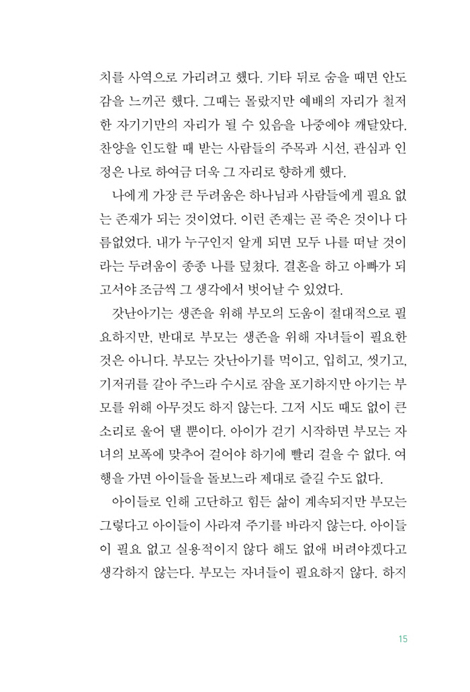 나에게 가장 큰 두려움은 하나님과 사람들에게 필요 없는 존재가 되는 것이었다. 이런 존재는 곧 죽은 것이나 다름없었다. 내가 누구인지 알게 되면 모두 나를 떠날 것이라는 두려움이 종종 나를 덮쳤다. 결혼을 하고 아빠가 되고서야 조금씩 그 생각에서 벗어날 수 있었다.