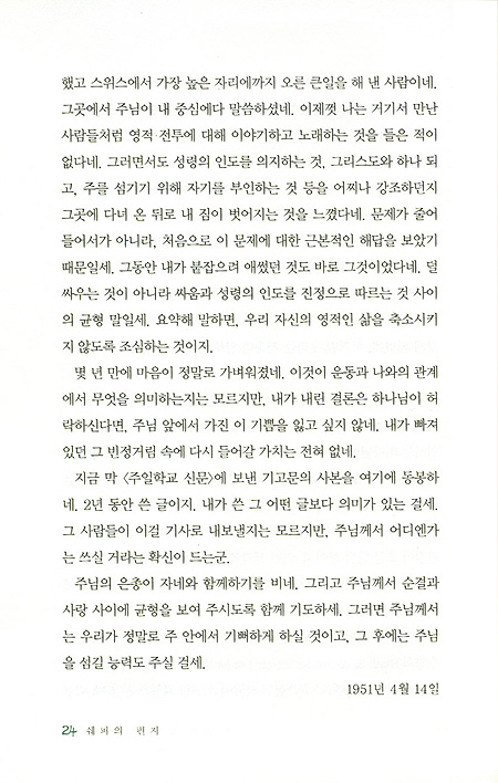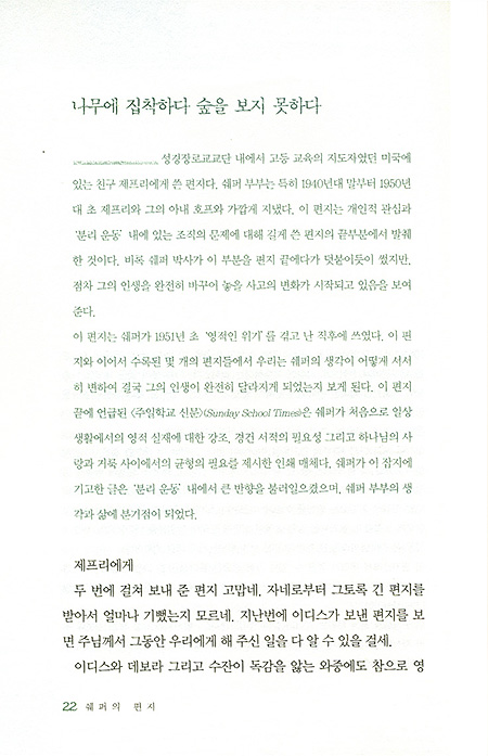 이 편지들을 편집하면서 나는 처음부터 세 가지 목적을 염두에 두었다.우선 쉐퍼 박사의 바람에 완전히 부합하도록 편지를 선정하고 편집할 것,두 번재는 이 책을 읽는 사람들에게 기여하고 진정한 도움을 주는 좋은 책이 되도록 할