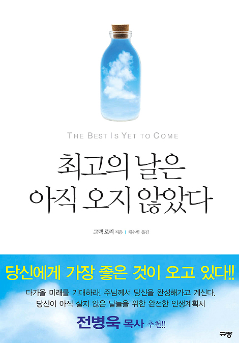 아쉬운 점은 이 그렉 로리가 국내에서는 잘 알려지지 않았다는 것이다. 그런데 그의 메시지 중에서도 진수眞髓라 할 만한 이 책, 「최고의 날은 아직 오지 않았다」가 규장에서 출간되었다고 하니 무척 반갑다.