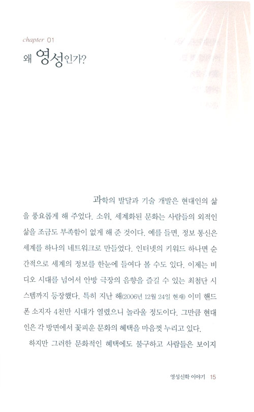 한국교회에도 90년대부터 영성추구의 바람이 불었습니다. 성장주의에 지쳐있던 한국교회에 그런 영성 추구의 바람은 신선한 활력이 되었습니다. 그러나 문제는 종교개혁 신학에 조명받은 영성적 기반이 없이 대부분 카톨릭 신비주의에서 흘러온 영성을 배웠다는 것입니다. 이제 우리는 잃어버린 개혁주의자들의 신학과 영성에 눈을 돌려야 하고ㅡ 성경에 깊이 뿌리를 내려야 합니다. 종교개혁 신학에 바탕을 둔 영성이야 말로 우리가 추구해야 할 진정한 영성입니다.