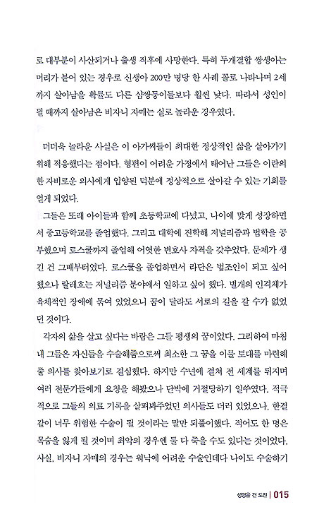 벤 카슨 Ben Carson 박사는 좆ㄴ스홉킨스 대학병원에서 신경외과 ·성형외과·종양학과·소아과 교수이자 소아신경외과 과장으로 일하고 있다. 그의 위험에 대한 현명한 태도는 세계 최초 샴쌍둥이 분리수술 성공이라는 명성을 그에게 안겨주었다. 또한 그는 힐러리 클린턴, 낸시 레이건, 월트 디즈니 CEO 로버트 아이거 등이 수상한 바 있는 '링컨 메달'의 2008년 수상자이기도 하다. 현재 캘로그, 코스트코, 아메리칸즈 프라미스 등의 대기업의 이사이며, 예일대학교 이사회의 명예의원이다. 저서로는 베스트셀러인 《벤 카슨의 싱크빅 Think Big》을 비롯하여《인생을 보려거든 큰 그림으로 보라 The Big Picture》《하나님이 주신 손 Gifted Hands》
