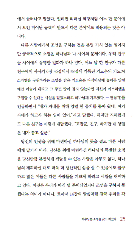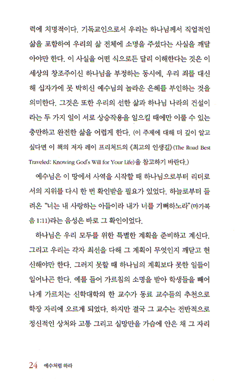 예를 들어 가르침의 소명을 받아 학생들을 빼어나게 가르치는 신학대학의 한 교수가 동료 교수들의 추천으로 학장 자리에 오르게 되었다. 하지만 결국 그 교수는 전반적으로 정신적인 상처와 고통 그리고 실망만을 가슴에 안은 채 그 자리에서 물러나고 말았다. 일테면 리더십 역량처럼 어느 한 분야에서 보인 뛰어난 능력이 반드시 다른 분야에도 적용되는 것은 아니다. (중략) 당신의 인생을 위해 마련하신 하나님의 뜻을 결코 다른 사람에게 맡기지 마라. 당신을 위해 마련하신 하나님의 특별한 소명을 당신만큼 분명하게 깨달을 수 있는 사람은 아무도 없다. 하나님의 계획하신 대로 더욱 더 생산적인 삶을 살 수 있음에도 불구하고 많은 이들은 다른 사람들을 기쁘게 하려고 세월을 허비하고 있다.