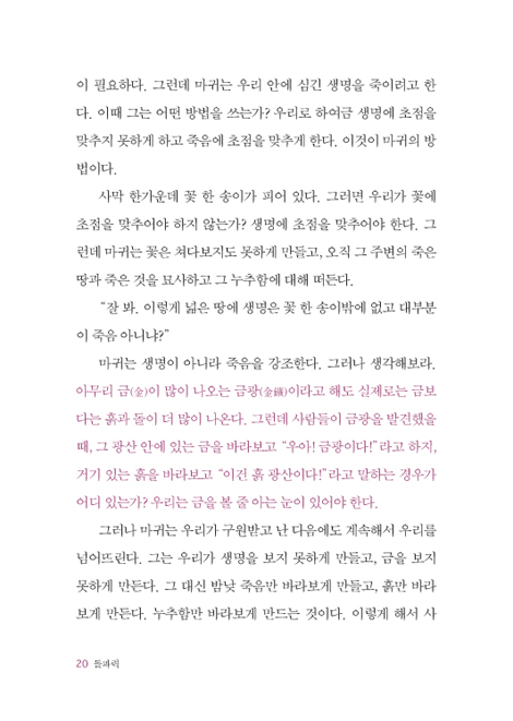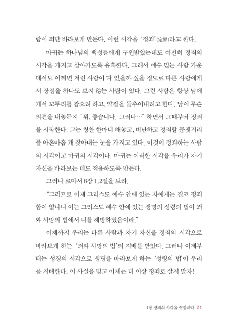 성경은 우리가 죄악과 직면하게 만든다. 결국 현실을 돌파하고 세상을 변화시킬 수 있는 힘의 원천이 어디 있는가? 내가 나의 문제와 직면하고, 남의 탓으로 돌리지 않는 데에 있다. 나의 회개와 나의 변화가 세상을 변화시킬 수 있다. _p27