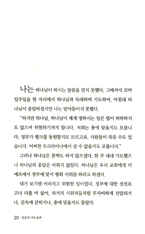 민심을 외면하는 정부와 갈수록 심화되는 경제 위기 속에서 많은 국민들의 불신과 허탈감, 무기력감이 극에 달하고 있다. 각박해진 사회를 하루하루 헤쳐 나가기에도 버거운 사람들에게 ‘정의’와 ‘희망’, ‘나라의 변화’는 멀게만 느껴질 뿐이다. 우리나라에는 수많은 교회들이 있고, 세계적인 규모를 자랑하는 대형 교회들도 많지만, 대부분의 교인들은 이 땅의 변화에 대해 어떤 생각을 갖고 있는가? 나라의 상황을 마음 아파하면서도 큰 변화를 기대하는 건 현실적으로 무리일 거라고 생각하거나, 변화를 위해 기도는 하지만 그 일은 언젠가 아주 특별한 사람들을 통해 이루어질 거라 생각하지는 않는가. 이 책 <믿음의 나비 효과>는, 국민의 발언권조차 박탈당했던 부패하고 억압된 나라에서 용기 있게 혁명적인 일들을 믿음으로 실천했던 한 목사를 통해, 어떻게 사람의 생각과 현실의 장벽을 뛰어넘은 커다란 변화가 일어날 수 있었는지 우리에게 보여 주고 있다.
