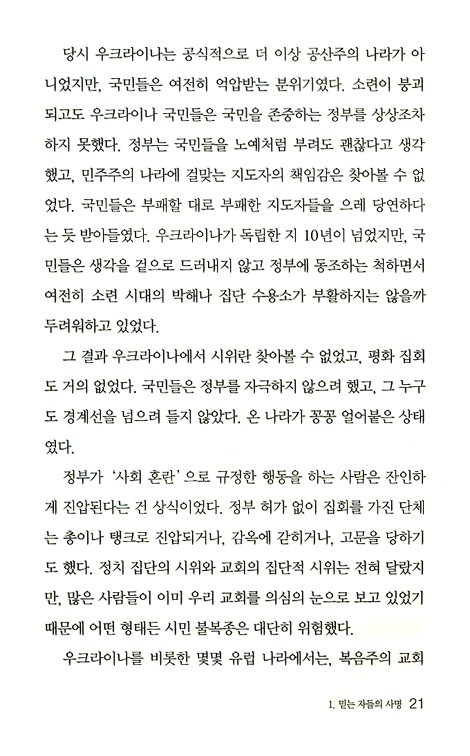 선데이 목사는 하나님 나라의 원리를 소개하면서, 교인들의 마음속에 사랑과 연민이 교차하는 곳이 바로 약속의 땅이며, 그 땅은 실제적으로 사회에 영향력을 미칠 수 있도록 하나님이 준비해 두신 영역이라고 했다. 약속된 땅을 찾아 성장하기 위해선 교인들이 끊임없이 교육을 받고 작은 일에도 부지런히 힘써야 하며, 목사나 교회 지도자는 그들이 교회 밖에서 진정한 하나님의 일꾼이 되게 도와야 한다고 했다. 선데이 목사는 실제로 하나님 나라의 원리를 자신의 삶과 교회에, 더 나아가 도시와 나라에 적용하여 변화를 일으켰다. 그래서 그의 이야기는 더욱 설득력이 있으며, 감동과 함께 변화에 대한 동기를 강하게 자극한다. 그뿐 아니라 저자가 변화의 과정 가운데 개인적으로 하나님과 어떻게 대화하며 어려움을 극복했는지, 변화를 예비하신 하나님의 심정이 어떤 것인지, 또 우리는 그것에 어떻게 반응해야 하는지 상세하게 알려 주어 실제로 이와 같은 혁명을 개인과 나라 가운데 경험하게 될 이들에게 도움이 되도록 했다. 지금 이 땅의 현실도 혼란과 어둠으로 뒤덮여 있던 우크라이나의 모습과 크게 다르지 않기에, 우리나라가 하나님의 질서로 다스려지길 열망하는 모든 교회 관계자들과 수많은 크리스천들에게도 이 책은 희망의 끈을 다시 한 번 다잡게 하는 계기를 마련해 줄 것이다.