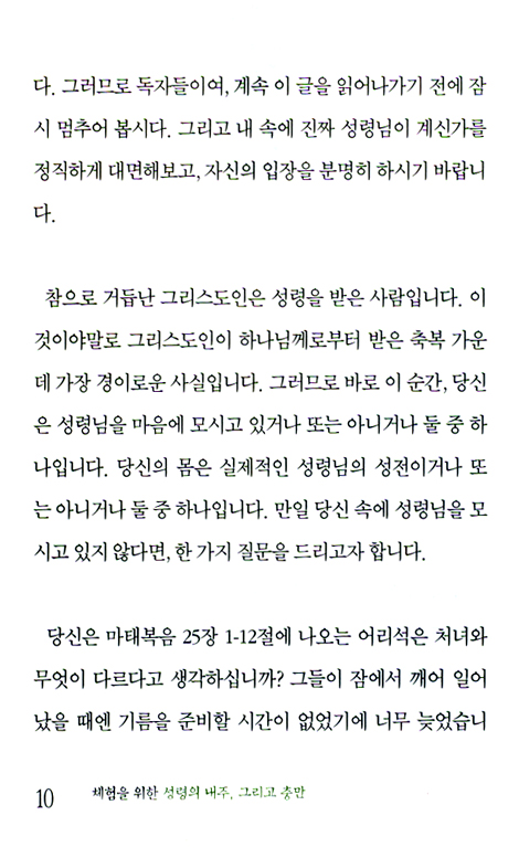 오늘날 성령님에 대한 관심은 폭증하고 있지만, 정말 성경적인 해답을 제시하고 있는 책은 많이 않다. 이 책은 당신의 성령 체험을 위한 책이다. 성령의 내주하심과 성령의 충만을 갈구하는 독자들에게 명쾌한 성경적인 해답을 제시해줄 것이다. 성령에 대한 잘못된 설명과 오해를 말끔히 씻어줄 것이며, 마음 깊숙한 곳에서 깊은 감격과 환희가 있을 것이다. 이제 성령의 세계로 당신을 초대한다.