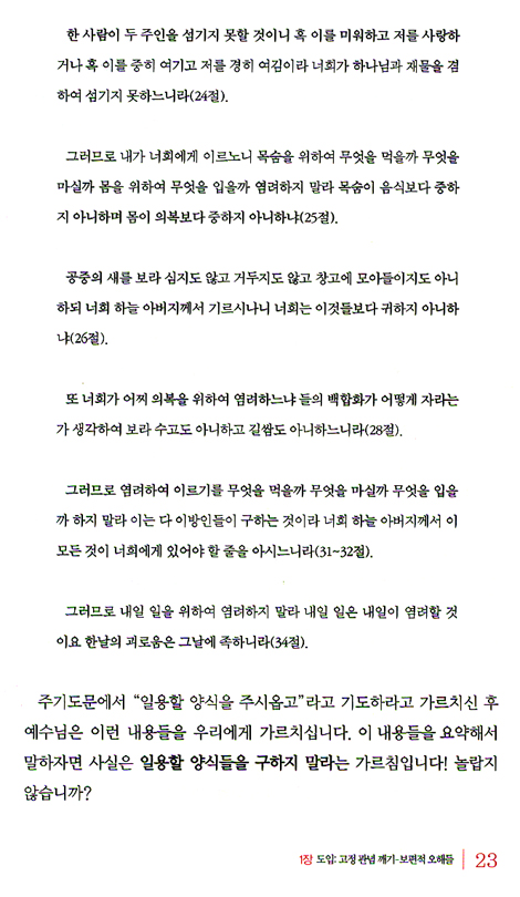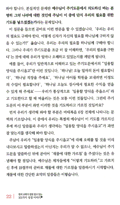 이전까지도 한국 교회가 말씀을 이해하는 양상에 대해서는 어느 정도 선지식을 갖고 있었지만, 이 작은 에피소드 하나는 저에게 커다란 충격을 안겨 주었고, 이 101가지나 되는 글을 쓰게 만드는 동기가 되었습니다.
