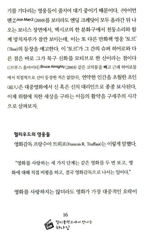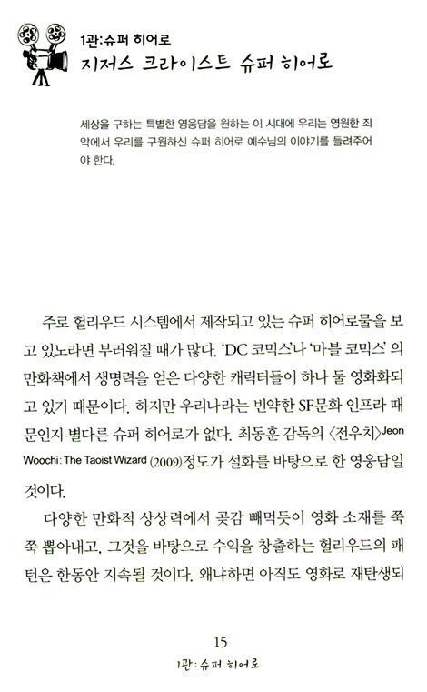 또한 판타스틱하고 과학적인 이야기 안에서 우리의 욕망과 현실을 더 재미있게 혹은 축소하거나 강조해서 바라볼 수 있는 것이다. 그렇다면 이렇게 대중적이고 가벼운 영화 속에서도 하나님의 메시지를 찾는 것이 가능한 일인가? 이 책에 담긴 글들은 나의 주관적인 생각이 많이 가미되어 있기에 이 해석이 정답이라고 주장하고 싶지는 않다. 다만 영화를 즐겨보는 관객의 입장에서 대중영화를 보는 시각에 다양한 관점이 존재하며, 또 하나님이 주신 귀한 선물이자 기적인 영화를 통해서 귀한 통찰을 얻을 수 있다는 점을 말하고 싶을 따름이다. 반드시 긍정적인 내용이 아니더라도, 부정적인 내용 가운데서도 우리는 반면교사의 지혜를 취할 수 있다. T. F. 로렌스(Lawrence)는 이렇게 말했다. “밤에 마음의 먼지 낀 구석에서 꿈꾸는 자들은 아침에 일어나 그것이 덧없는 것이었음을 깨닫는다. 그러나 대낮에 꿈꾸는 자들은 위험한 인간들이다. 눈을 부릅뜨고, 그 꿈을 현실로 바꿀 테니까.”