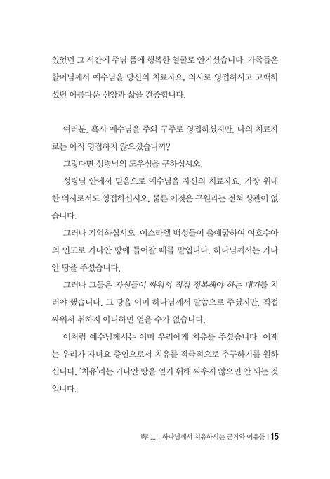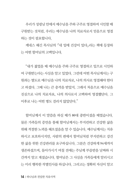 “신약 시대를 살고 있는 우리를 향하신 하나님의 계획을 주목하십시오. 치유는 하나님의 명령이요, 계획이십니다. 하나님께서는 성경 전체를 통해 치유에 대해 바르게 이해하기를 원하십니다. …… 무엇보다도 치유를 통해 우리는 하나님과 친밀한 관계를 누리고 있음을 점검할 수 있습니다.”(본문 26쪽 중에서).