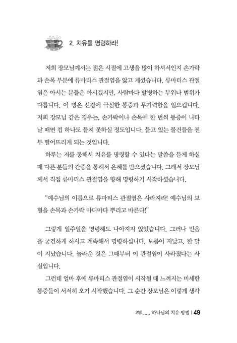 “앞에서 살펴본 것처럼, 하나님께서는 구약 시대에도 적극적으로 병을 고쳐주셨습니다. 신약 시대에는 더더욱 예수님을 통하여 병을 고쳐주셨고, 그것이 하나님의 소원이심을 보여주셨습니다. 또한 주님의 제자들도 그 모범을 따르기를 원하셨습니다. 이제는 저와 여러분에게도 그 모범을 따르라고 요청하십니다.”(본문 25쪽 중에서).