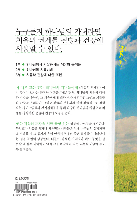 이 책은 본인이든지 다른 사람에게든지, 당신이 크리스천이라면 누구든지 하나님의 치유의 능력을 꼭 필요한 때에 적극적으로 체험하고 누리며 전하는 사람들이 되도록 만들어준다. 그러기 위해 ▪ 1부에서는 하나님께서 치유하시는 이유와 근거들을 성경적인 "가르침"에 바탕하여 확신하도록 하고, ▪ 2부에서는 구체적으로 실제 사용할 수 있게 치유의 다양한 방법들을 알려주는데, 읽는 이의 마음에 믿음을 북돋아준다. 특히 전국의 부흥집회와 매달 전국에서 진행되는 정기모임들과 정기집회들을 통해 치유받은 분들의 다양한 간증들을 맛보며 경험하는 가운데 그 방법들을 자신의 상황에서 함께 사용할 수 있도록 도와준다. ▪ 3부에서는 질병의 원인에 대한 균형 있는 성경적 가르침, 영혼의 돌봄 못지 않게 육적으로 방치하여 일찍 세상을 떠난 사람에게서 배우는 교훈, 그러나 언제나 주님의 십자가만을 바라보고 행할 때 치유의 좋은 결과가 나타남을 잊지 않도록 당부한다.