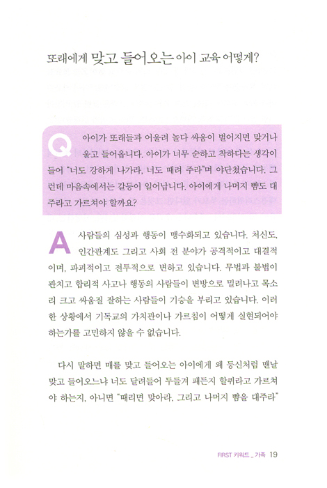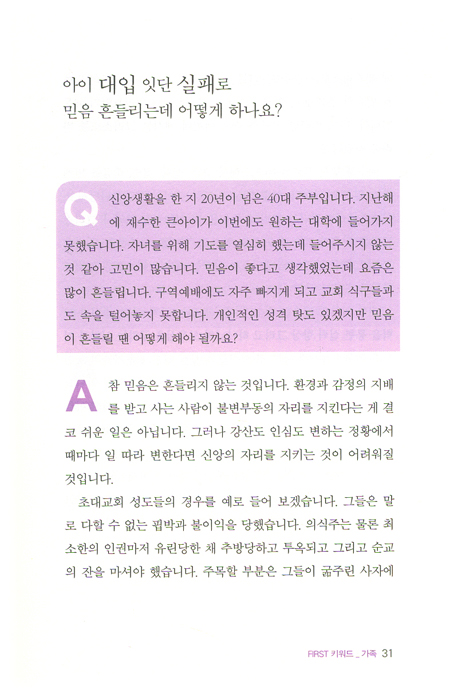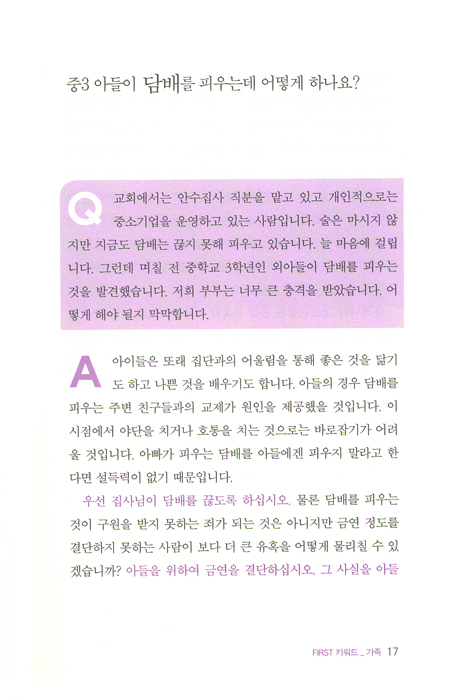1장 First 키워드_가족에서는 자녀교육과 신앙 지도에 따른 갈등, 부부 사이의 갈등, 시댁과 제사 문제로 파생되는 갈등, 그 외 가족 관계에서 파생되는 문제 등을 다루고 있다. 이 장에서는 ‘중3 아들이 담배를 피우는데 어떻게 하나요?’, ‘남편이 무교회주의자인데 어떻게 설득해야 하나요?’, ‘믿음 없는 시댁 전도하려면?’, ‘제사 음식 먹어도 되나요?’, ‘가족들 모두 종교가 달라 고민’ 등의 질문 외 23개의 가족에 관한 현실적인 질문과 해답이 제시되어 있다.