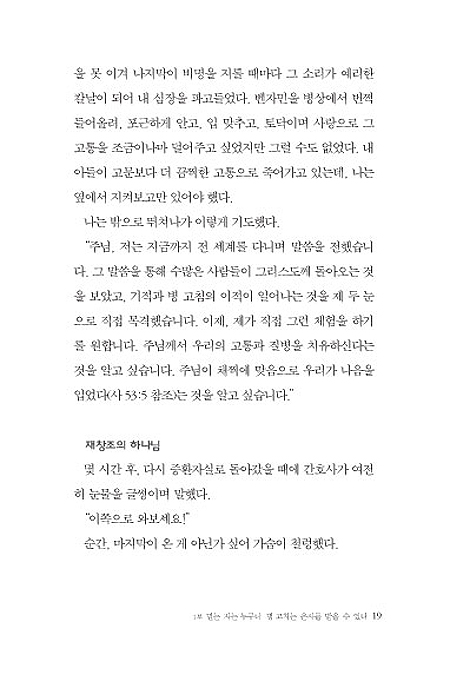 당신이 이 책을 읽어나갈 때에 영광의 왕이신 주님께서 당신을 가르치시고, 당신에게 영감을 주시며, 새롭게 기름을 부으셔서, 주님이 다시 오실 때까지 당신이 치유의 은사를 충분히 활용할 수 있게 되기를 간절히 기도한다. 당신이 “나를 믿는 자는 나의 하는 일을 저도 할 것이요 또한 이보다 큰 것도 하리니”(요 14:12)라고 말씀하신 주님의 약속에 주인공이 되기를 기도한다.