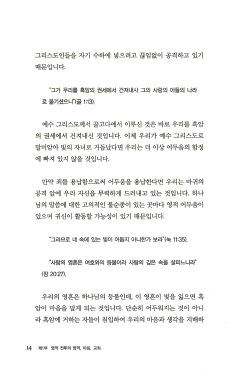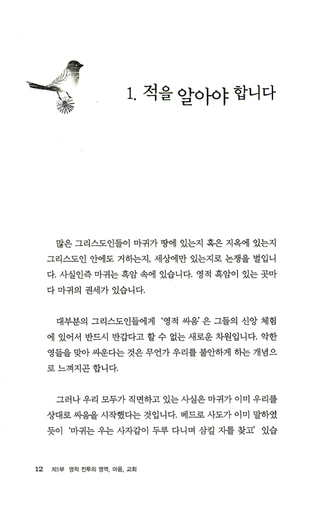 오늘날 많은 크리스천이 성경 공부와 신학 훈련을 통해 이성적 지식에는 충실하지만 영적 지식으로는 나아가지 못하고 있다. 영적 세계에 대해 마음을 열고 겸손히 성경을 통해 말씀하시는 하나님의 세계를 받아들이며 성령을 체험하는 것이 바로 참된 영적 지식의 출발점이다. 이 책은 영적 세계의 본질을 살피고 있으며 일상생활 가운데 숨어서 보이지 않는 영적인 실재들을 분별하는 데 도움이 되는 책으로 성령의 임재를 체험하며 하나님과 살아 있는 관계를 누리고자 하는 성도들에게 꼭 필요한 책이다.