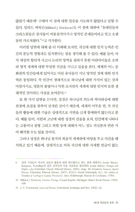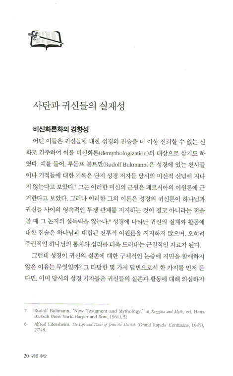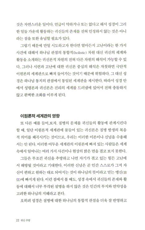 본 저서는 마귀와 귀신 실재론에 확실히 서서 신령주의와 이분법을 넘어서 복음주의적 해석을 제시한 탁월한 연구서다. 귀신을 두려워하거나 숭배하는 신령주의에 대하여는 성경적, 신학적, 심리학적 반박을, 귀신의 실재를 부인하는 자유주의에 대해서는 성경적 근거 및 구체적인 체험적 사례를 제시하고 있다. 마귀와 귀신들은 성령과 말씀의 검으로 쫓겨나간다는 승리자 예수 그리스도를 증거하고 있다.