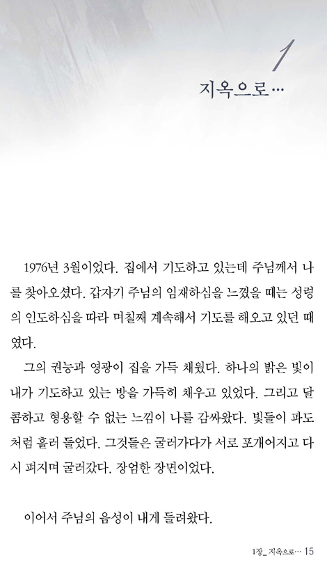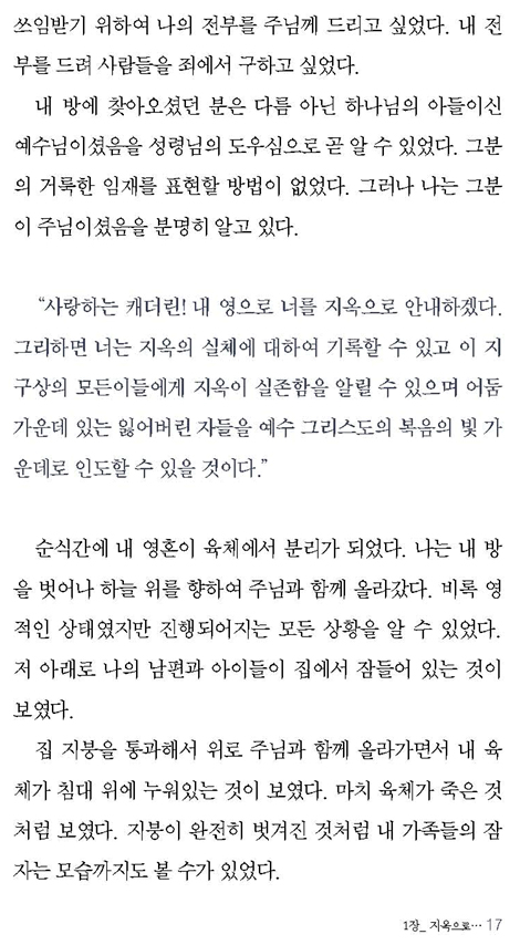 “내게 네게 보여주고 들려준 것들은 이 세상 사람들에게 전하고 기록할 목적으로 너는 태어났느니라. 내 말은 신실하며 사실이니라 천국과 지옥이 실존하는 것을 이 세상에 알리기 위해 너는 부르심을 받았느니라. 나, 예수는 영혼들을 구원하고 그들이 천국에 거할 처소를 준비하기 위하여 아버지께로부터 보내심을 받았다는 것을 너는 이 세상에 알려야 한다.” <본문 중에서>