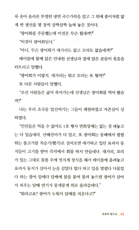 중국 땅에서 네 번씩이나 감옥에 들어가 중국 공안들로부터 당해야 했던 고초와 탈북자들과 함께 그녀가 겪은 참혹한 인권유린 실상은 소수의 탈북자들과 그녀 개인의 아픔을 떠나 이 시대를 살아가는 우리 민족의 슬픔이고 현실이었다.