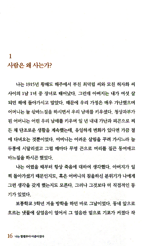 저는 일찍 아버지를 여의고 삯바느질로 생계를 이어 가던 홀어머니 밑에서 가난한 어린 시절을 보냈습니다. 열두 살 되던 해에 이성봉 목사님의 성화에 참석하여 어머니와 함께 그리스도인이 되었으나 제 마음에는 가난을 벗어나야겠다는 생각 이외에는 아무것도 없었습니다. 그 강박 관념 때문에 간호원이 되었고 산파가 되었습니다. 그리고 돈도 많이 모았습니다. 하나님의 은혜로 좋은 남편을 만나기도 했습니다.