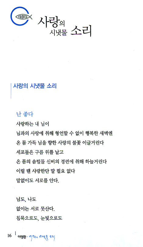모든 것이 부족하기만 한 제가 존경하는 목사님의 저서 ‘사랑의 시냇물 소리’가 출간된다는 소식을 지난 8월초, 두 번째 집회를 인도하면서 들었습니다. 반가움과 설레임으로 미처 완성되지도 않은 원고를, 숙소에서 밤이 새는지도 모르고 단숨에 읽어 버렸답니다. 깜짝 놀란 것은, 문장 하나하나가 너무도 젊고 아름다운 문학적인 감동이 다가왔다는 것입니다. 마치 저명한 문필가의 글을 연상케 할 정도로 깊이 매료되었답니다. 목사님 목회의 기적 같은 은총과 인생 축복의 비밀, 혼자만의 몸부림과 눈물, 내면의 갈등 등을 그대로 진솔하게 담아놓은 ‘사랑의 시냇물 소리’가 이 땅 위의 믿는 자는 물론, 비기독교인들까지도 그들의 영혼을 뒤흔들고 살아계신 하나님을 정녕 만날 수 있는 가교역할을 할 것임을 확신하며 감히 소감문을 올립니다. 할렐루야!!!