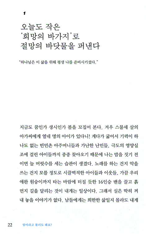 우리 집의 천사들은 나를 엄마라 부른다. 기아와 질병 등으로 엄마를 잃은 400명의 마을 아이들도 나를 엄마라 부른다. 하도 많은 아이가 엄마라고 불러 대니까 이젠 집 근처에 사는 마을 어르신들까지 나