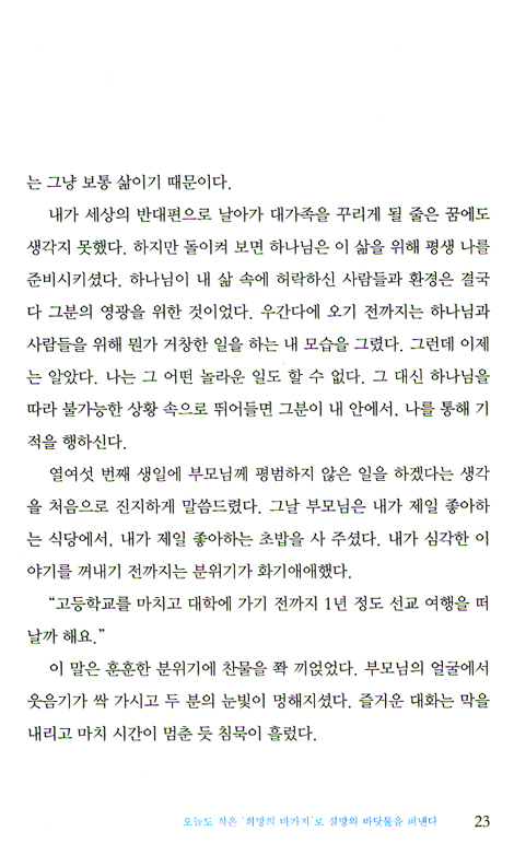 이 책은 저자를 초인이나 성자로 치켜세우지 않는다. 또 그녀가 여유 있는 미국에서의 삶을 내려놓고 지금의 생활 방식을 택했다고 해서 그녀를 지나치게 추앙하지도 않는다. 오히려 저자는 이 책에서 신앙인이라면 누구나 고민했을 법한 딜레마들과 자신의 모순된 감정, 한계 등을 여실히 보여 주며 우리의 마음을 보듬는다. 그리고 열여덟 살의 한 평범한 소녀가 하나님을 사랑해서, 그분이 주시는 마음에 무조건 “예!”하고 순종했을 때 펼쳐지는 놀라운 기적의 현장으로 우리를 초대한다.
