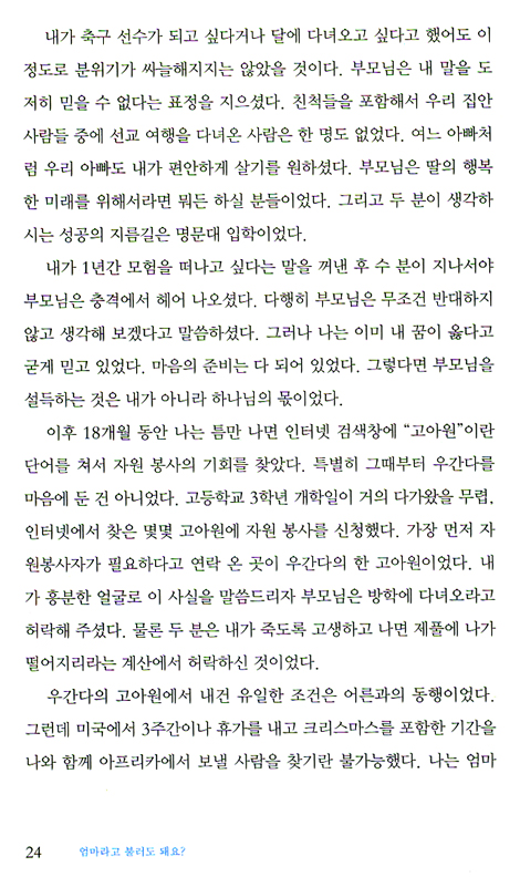 대학 입학 전 1년만 머물 작정으로 선교 여행을 떠났던 우간다였다. 그러나 어느 날, 애처로운 상황에 처해 잠시 맡아 돌봐 주던 다섯 살배기 스코비아가 어렵사리 꺼낸 한 마디, “엄마라고 불러도 돼요?”라는 말이 그녀의 삶을 새로운 지경으로 이끌게 된다. 이제 그녀는 선교사나 구호 기관의 일원이 아닌 우간다 아이들의 ‘진짜 엄마’가 되고, 그들의 ‘진짜 가족’으로 평생 그 땅에서 살기로 결정한다.