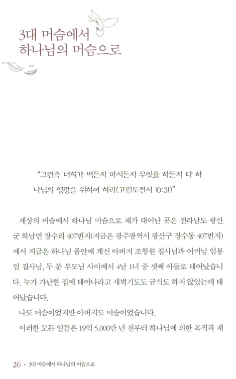 이 시대에 꼭 필요한, 조삭개오 목사님의 저서 《세상의 머슴에서 하나님의 머슴으로》가 이미 출간되어 대히트를 친 것을 보고 나는 엄청난 도전 정신과 감동과 은혜를 받았습니다. 위장도 없고 가식과 포장도 없습니다. 생생하고 생동감 있는, 살아 있는 간증입니다. 저자의 책은 너무나 실감 나고 재미있습니다. 순식간에 책을 다 보고 많은 유익과 지식을 얻었습니다.