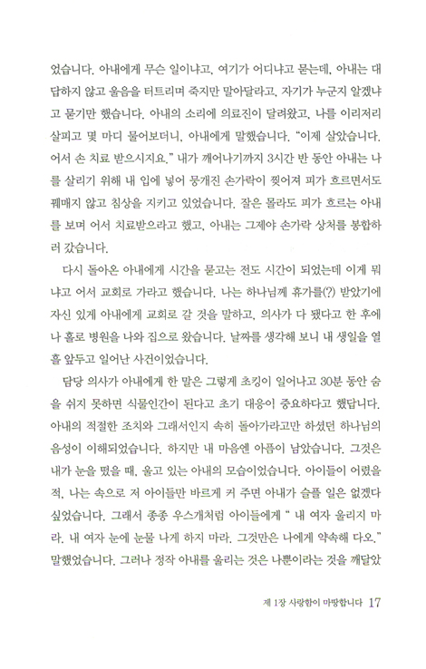 저자는 이 책을 통해 개척교회의 목회에 하나님의 사랑이라는 주제를 성경으로부터 묵상하고 해석하며, 적용하고자 했다. 특히 개척교회의 무덤이라고 소문난 지역에 본인의 가족 네 명이 각오하고 개척하였다. 이전의 교회로부터 도움이나 교인들을 모으지 않고, 오직 불신자를 전도하여 시작하였으며, 그런 가운데 죽음의 고비도 넘기며 오늘에 이르렀다.