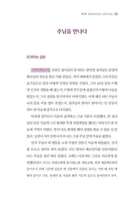 남편이 먼저 하나님 나라로 떠난 슬픔을 믿음으로 다독인 이야기는 진한 감동으로 다가옵니다.