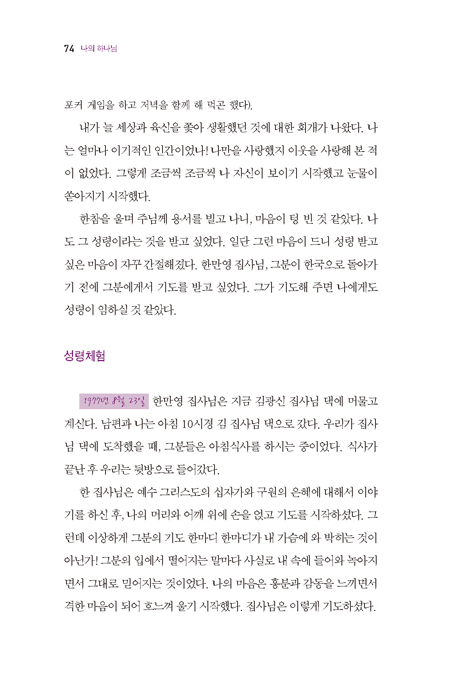 그 놀라운 이야기들을 이제 책으로 접할 수 있다는 것은 참으로 기 쁘고 반가운 일이 아닐 수 없습니다. 특별히 이 책 『나의 하나님』이 성 리 박사가 평소에 꼼꼼히 써 온 일기를 토대로 하고 있어서 더욱 생생 하게 느껴집니다.