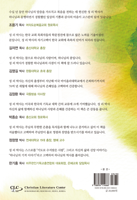 성 리 박사는 참으로 하나님의 사람이며, 하나님의 종입니다. 성 리 박사가 경험한 하나님과의 사귐이 이 책에 잘 드러나 있습니다. 이 책을 보는 이마다 성 리 박사의 삶 가운데 결국 합력하여 선을 이루신 하나님을 알게 되고, 그 하나님께서 여러분과도 동행하기를 원하시는 분임을 깨달아 다시 한 번 진정한 크리스천으로 거듭나는 귀한 은혜의 시간을 가지게 되리라 믿습니다.