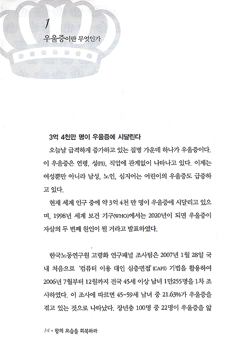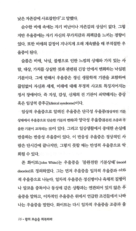 보이기도 했다. 문제는, 주변에 우울증 환자가 많고(전국민의 28%) 고통을 많이 받고 있음에도 적절한 도움과 치료에 어려움이 있다는 것이다. 저자는 죽음으로 몰고가는 우울증에서 벗어나 왕 같은 모습으로 회복하도록 여러 치료 방법들을 자세히 가르쳐준다. 특히 교회내의 사람들이 우울증에 무지하여 우울증으로 어려움 당하는 사람을 돕기는커녕 오히려 상처주는 경우가 많아 더욱 안타깝다. 이 책은 우울증 환자뿐 아니라 내면아이 치유, 상한마음 치유, 낮은 자존감 치유에 크게 도움을 주고, 성도들의 치유목회 및 양육을 하는 목사, 전도사, 구역장, 성경공부 인도자 등 중직자들에게 큰 도움을 줄 것이다.