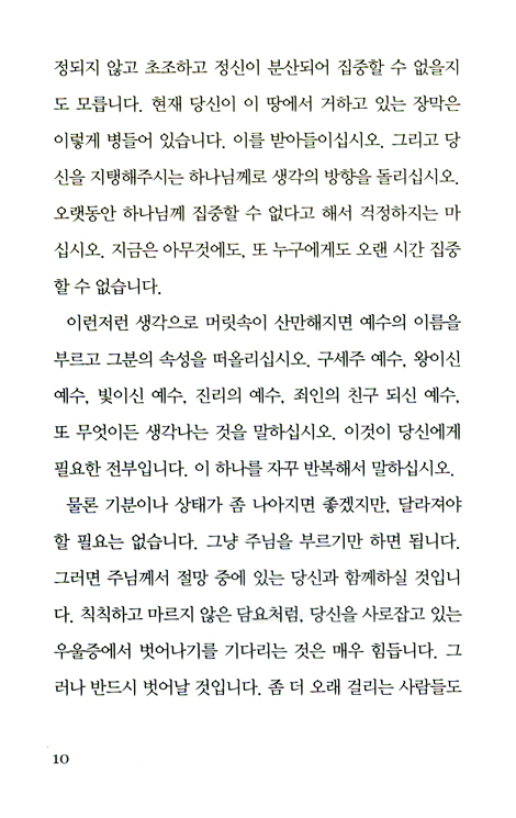 이런저런 생각으로 머릿속이 산만해지면 예수의 이름을 부르고 그분의 속성을 떠올리십시오. 구제주 예수, 왕이신 예수, 빛이신 예수, 진리의 예수, 죄인의 친구 되신 예수, 또 무엇이든 생각나는 것을 말하십시오.