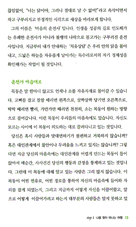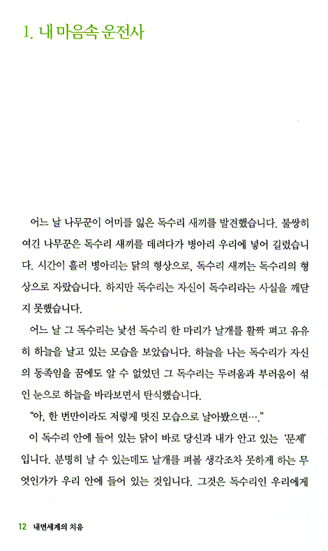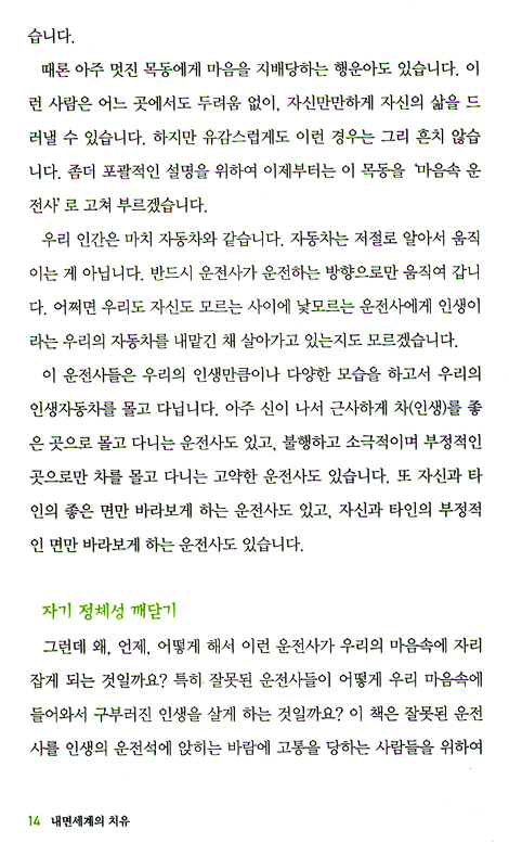 이런 나에게 기적이 찾아왔습니다. 잃어버렸던 나의 참된 자아를 되찾게 된 것입니다. 이 기적은 나이 서른여섯에 만난 한 치유그룹을 통해서 일어났습니다. 무려 일 년 동안이나 계속된 치유작업을 통해 어둠 속에서 태양이 비치는 세상으로 걸어나온 것입니다. ─ 머리말 중에서