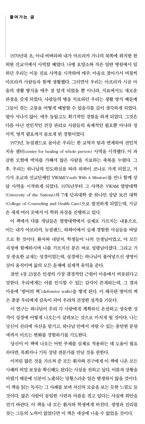 어쩌면 우리가 우리 삶 전체에서 경험하는 가장 큰 도전은 왜곡된 자기 방어의 벽으로 둘러싸인 마음을 변화시키는 일인지도 모른다. 저자는 우리 마음에 하나님의 다림줄을 내려서 우리 내면 깊숙한 곳에 남아 있는 쓴 뿌리와 같은 마음의 상처를 치유하고 올바르게 세우라고 권면한다.