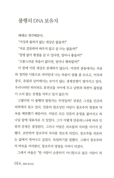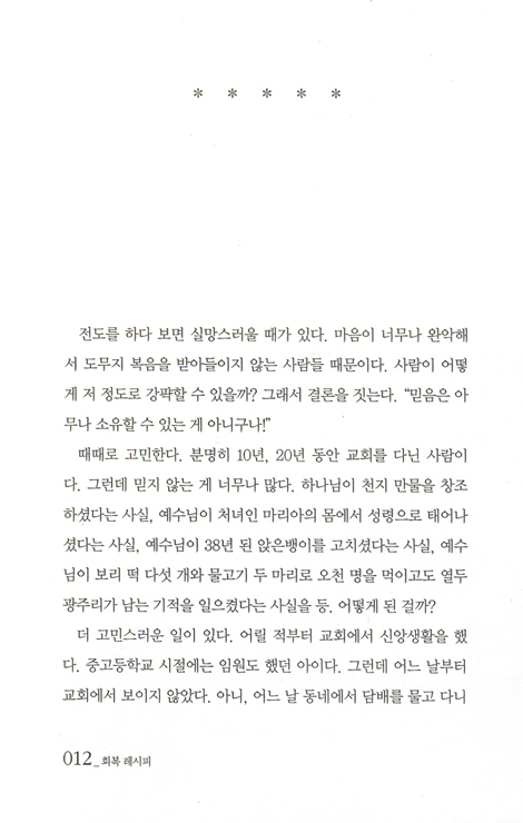 소망과 행복을 가꾸어가는 이 책은 당신의 용트림을 도와줄 것이다. 이 책은 믿음 회복, 예배 회복, 말씀 회복, 기도 회복을 위한 멋진 레시피가 될 것이다. 열정 회복, 소망 회복, 사명 회복을 위한 구체적인 나침반이 될 것이다. 나아가 자아 회복, 습관 회복, 생각 회복, 관계 회복을 통해 새로운 인생을 리모델링할 수 있도록 도와줄 것이다. 이 책을 손에 쥔 당신이 희망의 세계로, 행복한 인생으로 안내받을 수 있기를 기대한다.