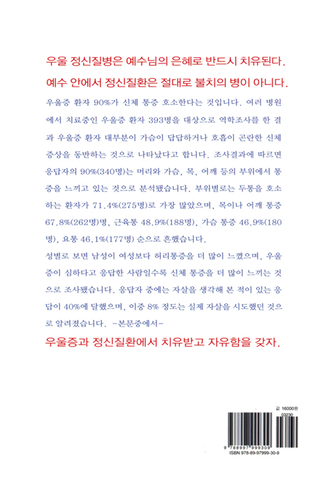 이 책은 저자가 지난 16년 동안 성령치유 사역 간 우울증 정신질병 환자를