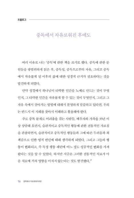 여러 이유로 나는 ‘중독’에 관한 책을 쓰기로 했다. 중독에 관한 문헌들을 광범위하게 읽은 후, 중독성, 중독으로부터 자유, 그리고 중독에서 자유롭게 된 이후의 삶에 대한 성경적 근거가 필요하다는 것을 발견하게 되었다.