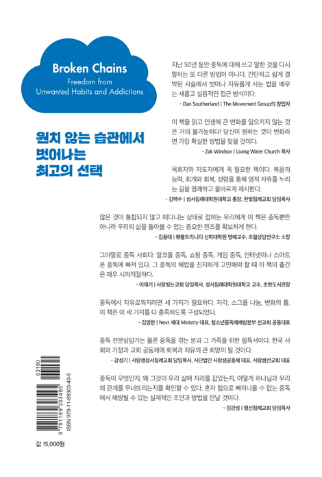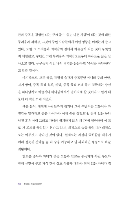중독에서 자유로워지려면 세 가지가 필요하다. 자각, 소그룹 나눔, 변화의 틀. 이 책은 이 세 가지를 다 충족하도록 구성되었다. 중독의 사슬에서 자유로워지기를 소망하는 모두에게 이 책을 추천한다!