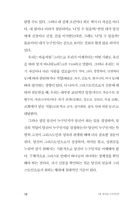 이 책에서 말하는 바를 한 문장으로 요약하면 이렇다. “자기 신분을 확인하는 것은 믿음과 그리스도인으로 취하는 행위에 절대적인 기준이 된다.” 이렇듯 우리가 하나님의 자녀임을 깨닫고 그 모습에 걸맞은 삶을 살아가는 것이야말로 절대 변할 수 없는 진리다. 아무리 오랜 시간 교회를 다닌 자라도 이 절대적 기준이 삶에 자리 잡지 못한다면 결코 신앙적 성장이 이루어지지 않을 것이다. 그리스도 안에서 내가 누구인지 아는 것, 이것이 신앙생활 하는 데 가장 기본이 된다는 것은 이 책을 읽은 독자라면 모두가 공감하는 사실일 것이다. 그리고 이 책이 스테디셀러가 되었다는 것도 그만큼 우리 신분을 아는 것이 신앙생활에서 중요하다는 사실을 증명한다.