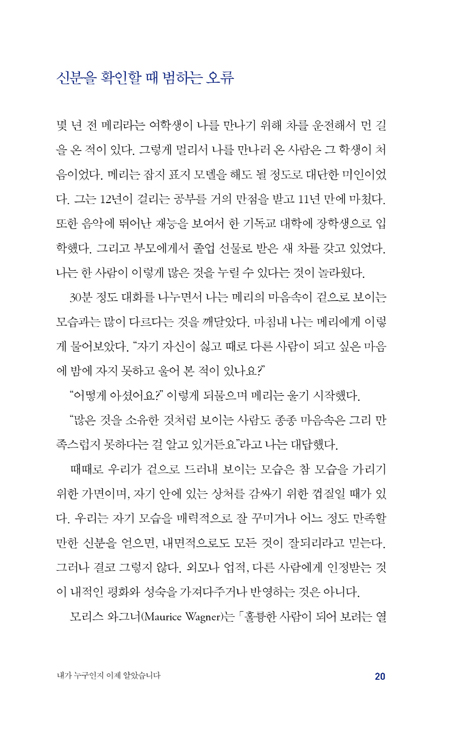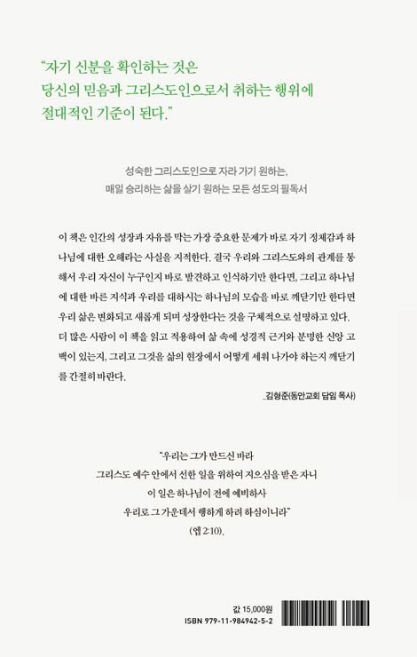 시대와 장소를 불문하고 겉으로는 괜찮아 보여도 내면은 상처투성이인 그리스도인이 많다. ‘나는 누구인가’라는 아주 간단한 이 질문에 명확하고 확신 있는 태도로 하나님의 자녀임을 고백하지 못한다면 우리는 매일 치러야 하는 영적 싸움에서 언제라도 넘어질 수 있다. 이 책을 통해 젊은 세대든 나이든 세대든 그리스도 안에서 자신의 신분을 깨달아 참된 자유를 누릴 수 있기를 소망한다.